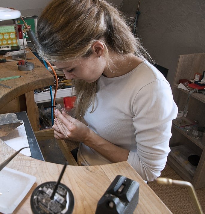 Dans mon atelier je dessine, façonne et donne vie à vos bijoux les plus précieux.